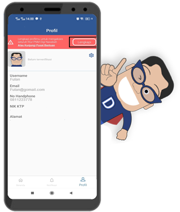Jika kamu sudah terdaftar PNM Digi Nasabah dan sudah berhasil login, silahkan lengkapi profile agar kamu dapat mengakses seluruh fitur yang ada di PNM Digi Nasabah .