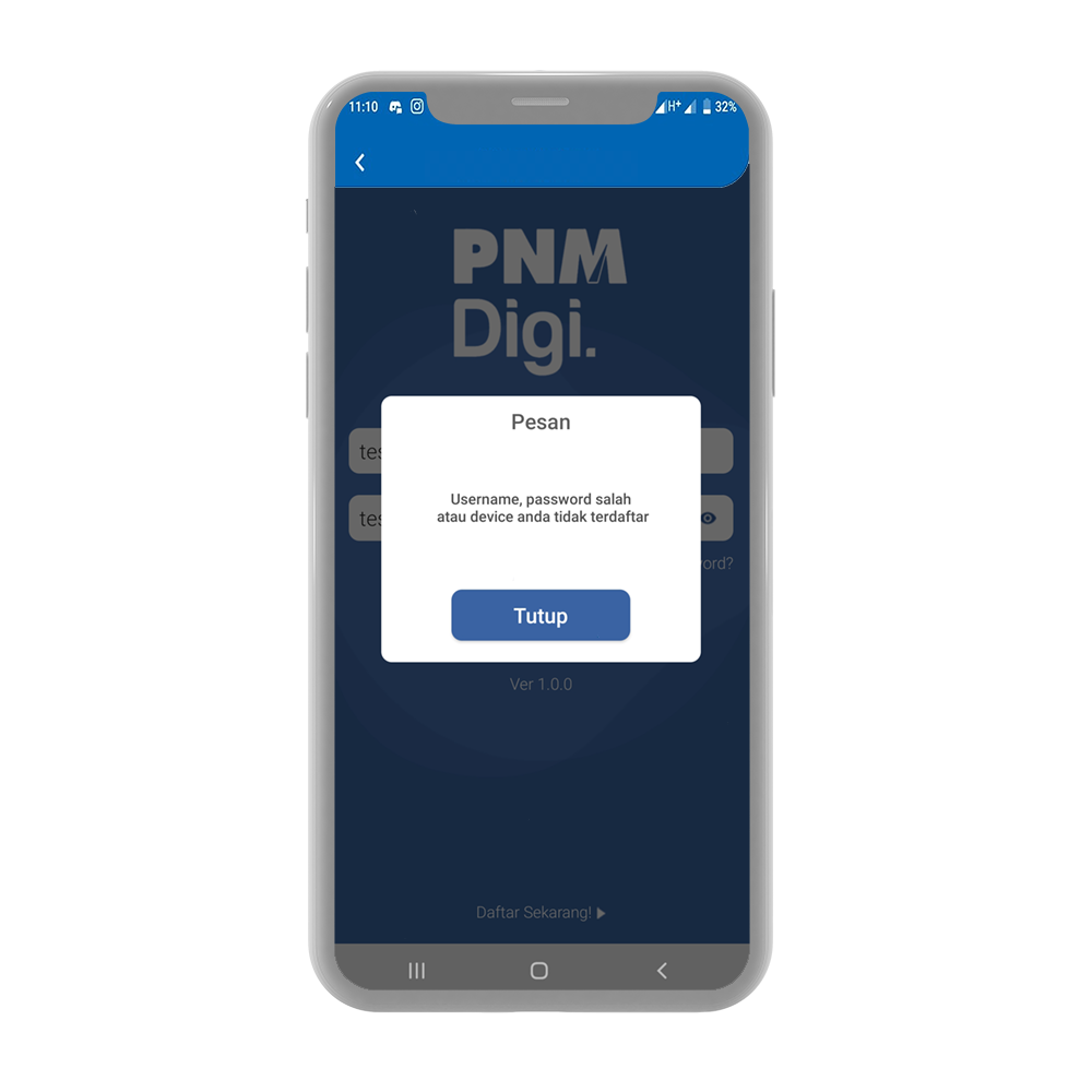 - Jika muncul notif ‘Username, password salah atau Device anda tidak terdaftar’ maka hal yang harus dilakukan adalah klik tulisan ” versi 1.0.0” dibawah form login